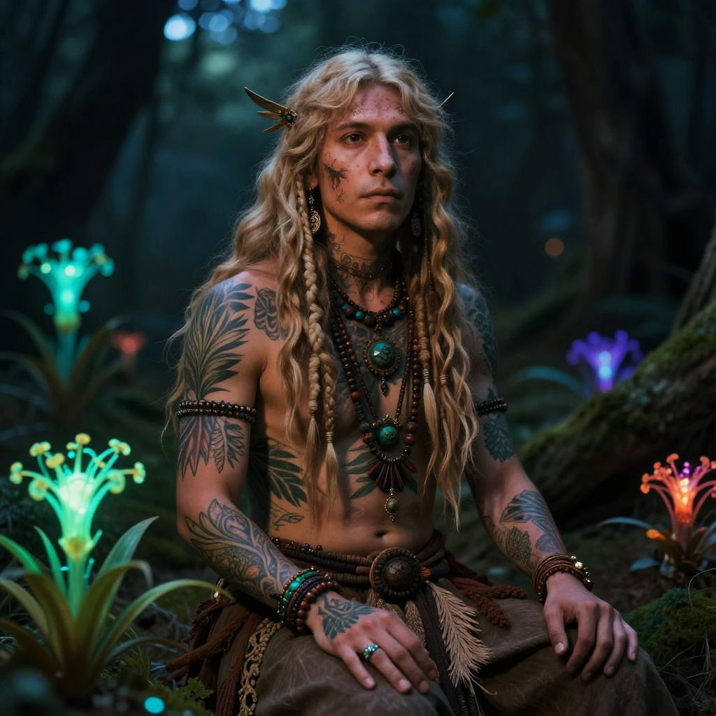 Realistic photo.mystical shaman with nature-inspired tattoos and bioluminescent plants, colorful and cinematic style by Brian Froud, Alan Lee, Arthur Rackham. realistic photo