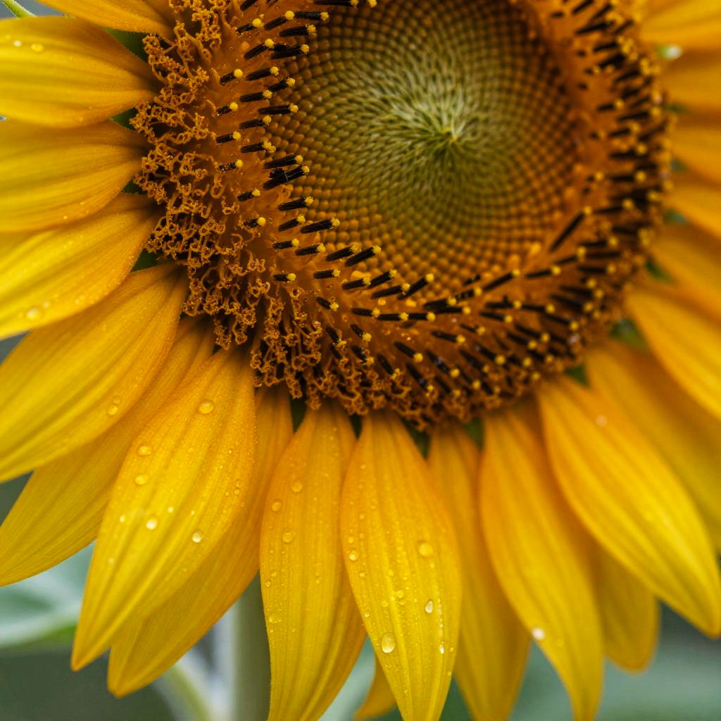 Close-up macro shot of sonnenblumen petals and seeds covered with morning dew, soft focus background of green stalks and leaves, capturing the delicate texture and vibrant yellow color of the sunflower, sparkling droplets reflecting early sunlight.