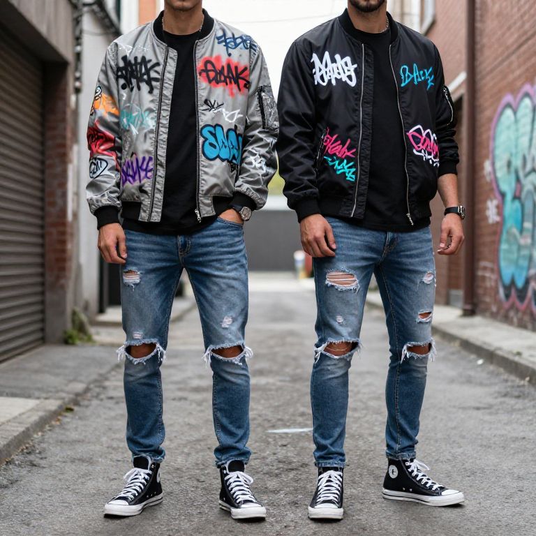 Streetwear bomber jackets with graffiti prints, worn with ripped skinny jeans and high-top sneakers, alleyway setting, realistic street fashion photography