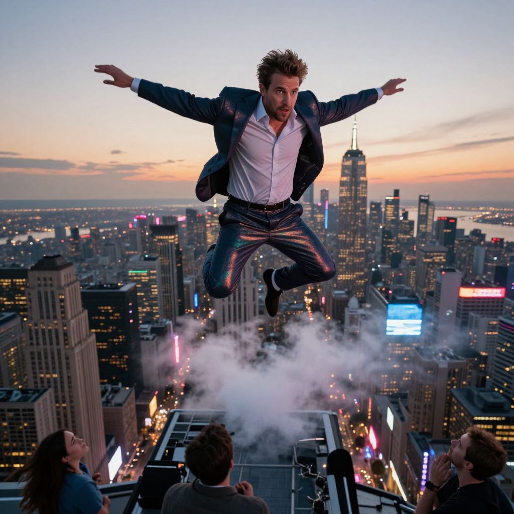 [[man,leap day background]]Spectacular aerial view of a bustling metropolis at sunset, a single figure in mid-air, arms outstretched, as he takes a massive leap over the towering skyscrapers, vibrant neon lights reflecting off his suit, clouds of smoke billowing beneath him, people below looking up in awe, dynamic motion blur effect, Leap Day celebration theme Man has masculine face and piercing eyes