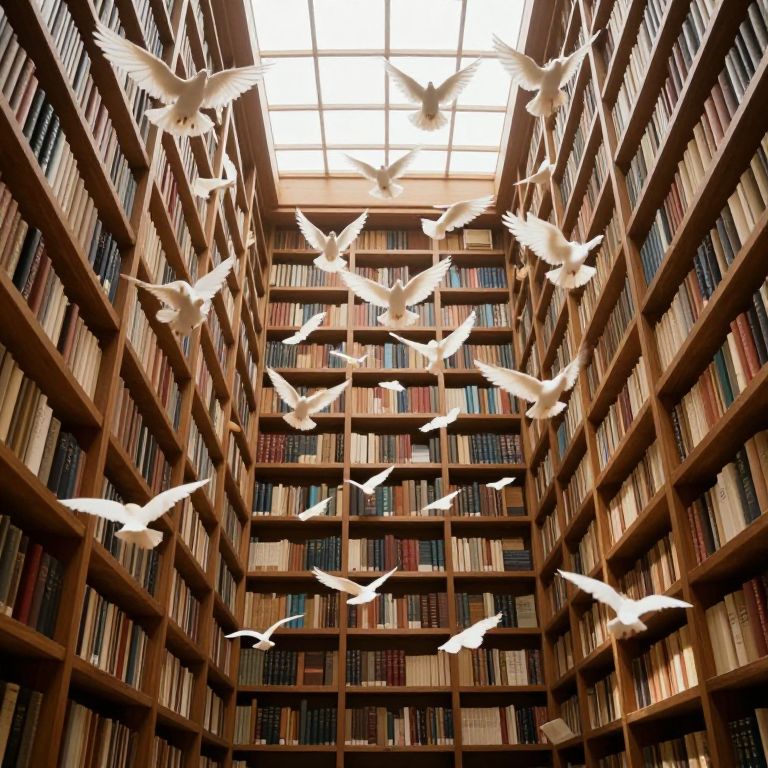 Books float serenely between towering wooden shelves, their pages fluttering like wings as they circle amidst a flock of doves soaring through the ethereal light filtering through the ceiling, creating a surreal library where knowledge and nature intertwine.