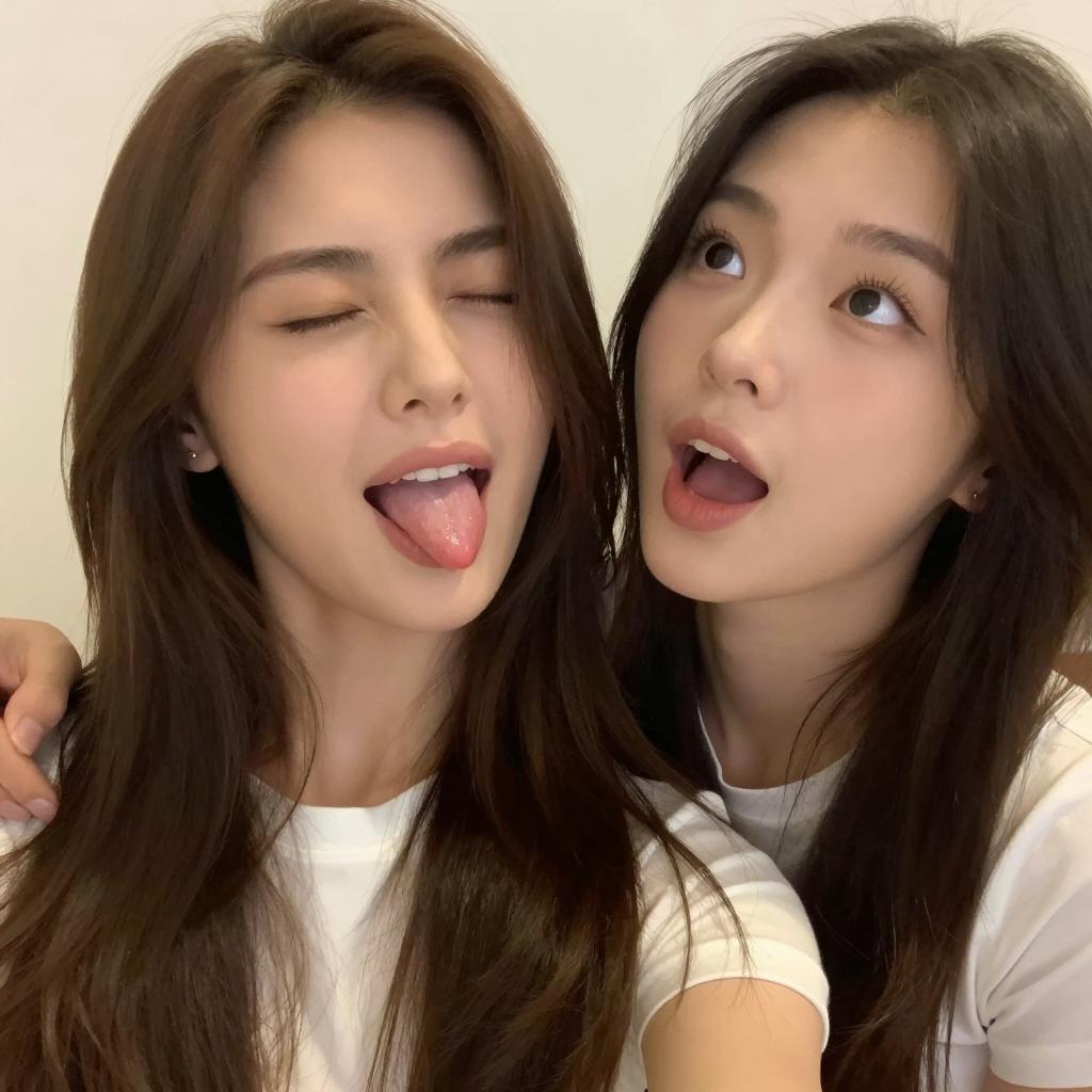 Photograph of two young women with long, straight, blonde hair. Both have light skin, full eyebrows, long eyelashes, and pink lips. The woman on the left has a neutral expression, while the woman on the right pouts her lips. They are wearing white tops and standing close together. Background includes a ceiling with exposed pipes.