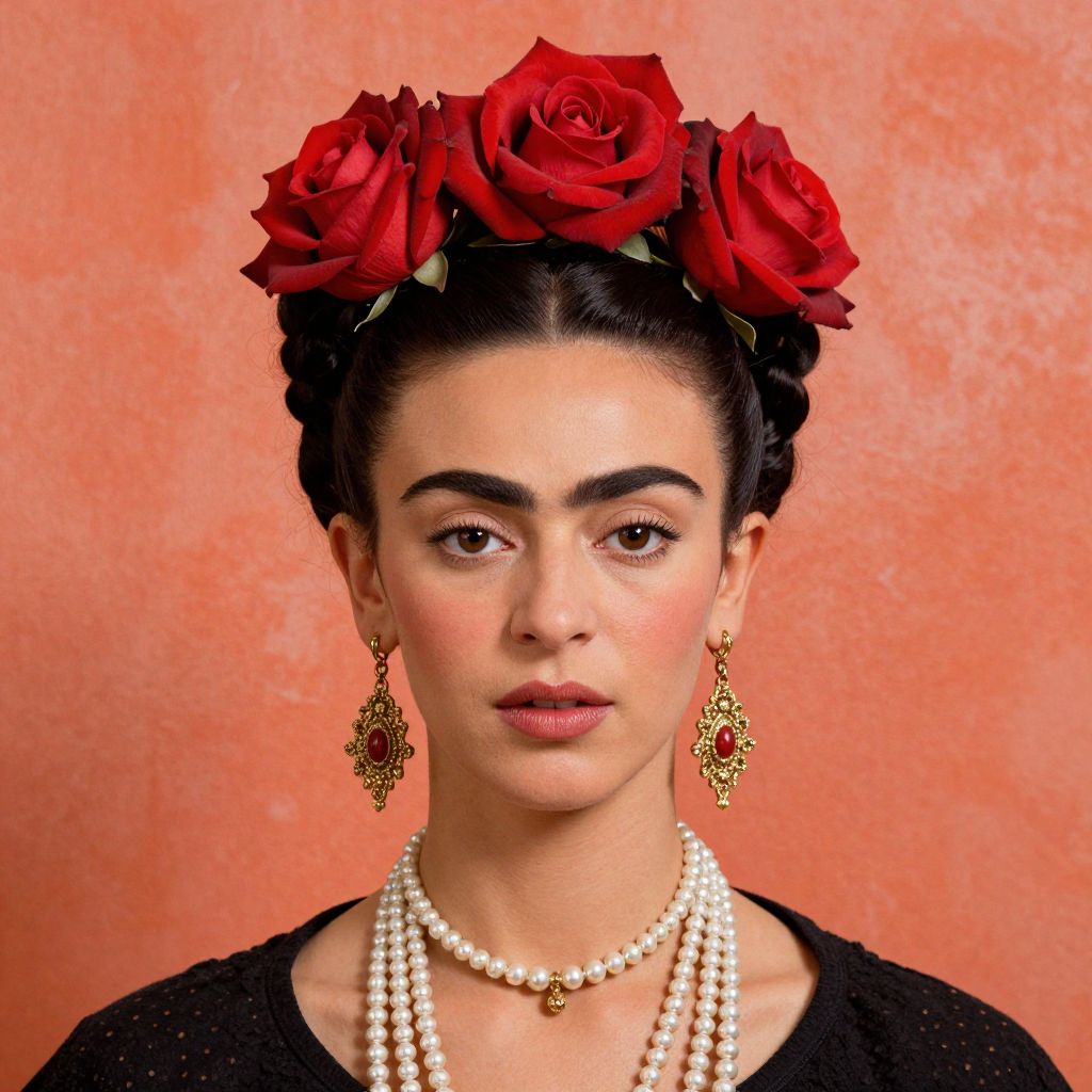 Frida Kahlo-inspired portrait featuring a woman adorned with three vibrant red roses atop her dark, intricately styled hair, complemented by ornate gold earrings and layered pearl necklaces, set against a textured coral background.