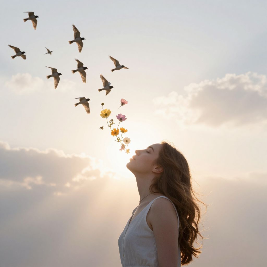 A woman exhales a cascade of delicate flowers that transform into a flock of birds, soaring into a radiant, ethereal sky.