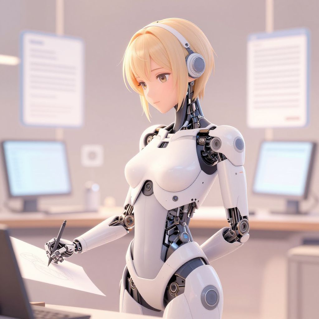 Digital anime-style artwork of a blonde, female, humanoid robot with white and black cybernetic armor, holding a paper, in a brightly lit,
