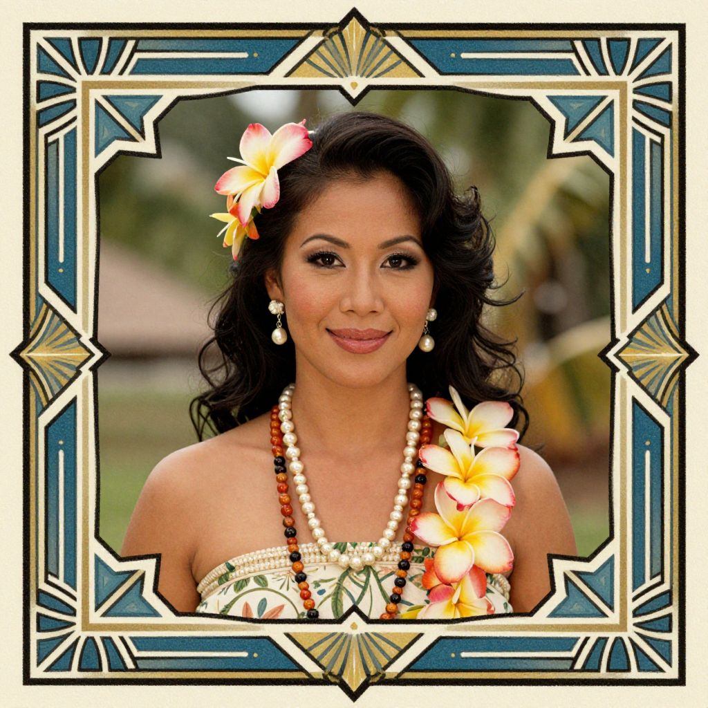 A vintage Hawaiian woman adorned with flowers and a necklace, framed by a decorative Art Deco border.