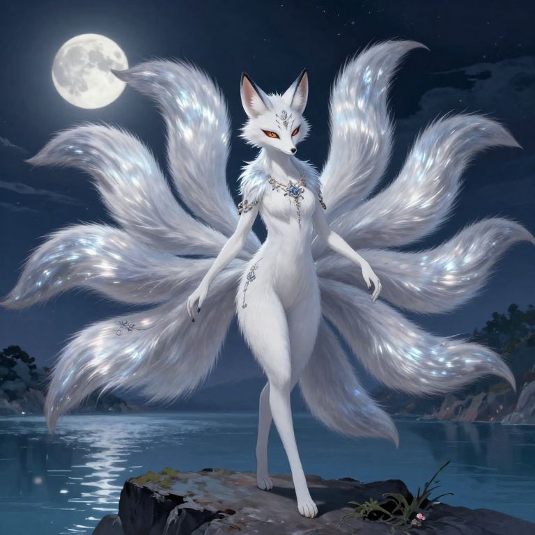 Kitsune character design, slender fox humanoid with nine shimmering tails and silver-white fur, graceful and mysterious, adorned with delicate jewelry and floral motifs, standing on a moonlit cliff overlooking a mystical lake, painterly style with rich colors and delicate light reflections.