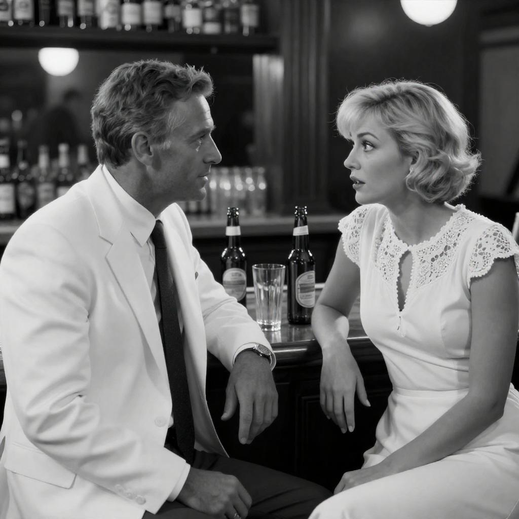 Black and white photograph of a man and woman sitting at a bar. Man in white suit and dark tie, short gray hair, looking at woman. Woman with short blonde hair, white dress with lace collar, surprised expression. Bar counter with three beer bottles, tall glass, ashtray. Reflection in background. Man's left hand on counter, woman's right hand holding beer bottle.