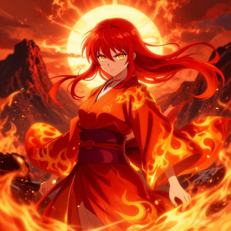 Fire element anime girl with flowing crimson hair, surrounded by flickering flames, intense amber eyes glowing, dressed in a fiery red and orange kimono with intricate flame patterns, standing in a volcanic landscape under a blazing sun, dynamic and powerful pose.