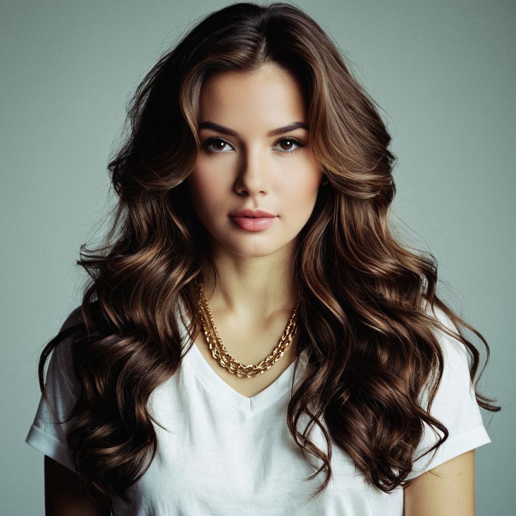 Close-up portrait of a young woman with long, brown, wavy hair wearing a white shirt and gold chain necklace. She has well-groomed eyebrows, natural makeup, and is looking directly at the camera against a neutral background.