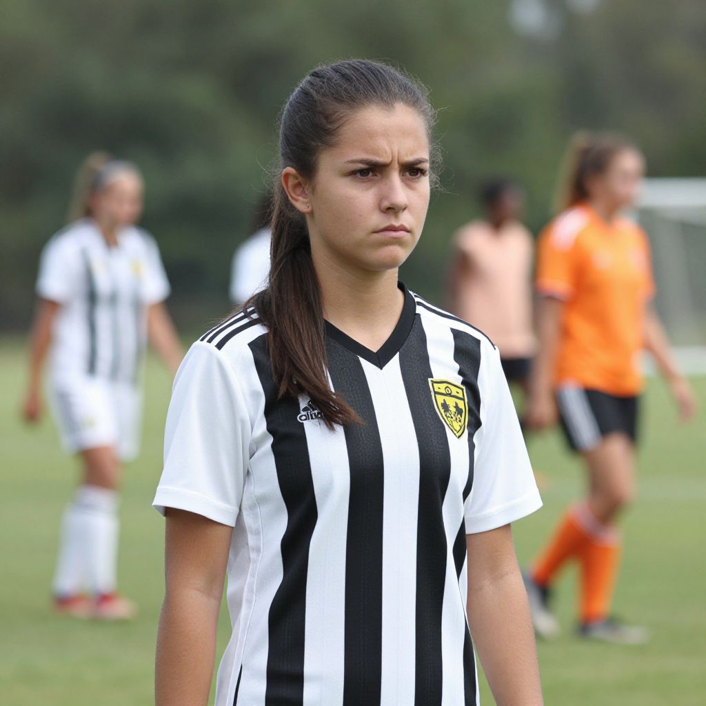 Photograph of focused young woman with dark hair in black-and-white striped soccer jersey, standing on grass field, blurred teammates in background.