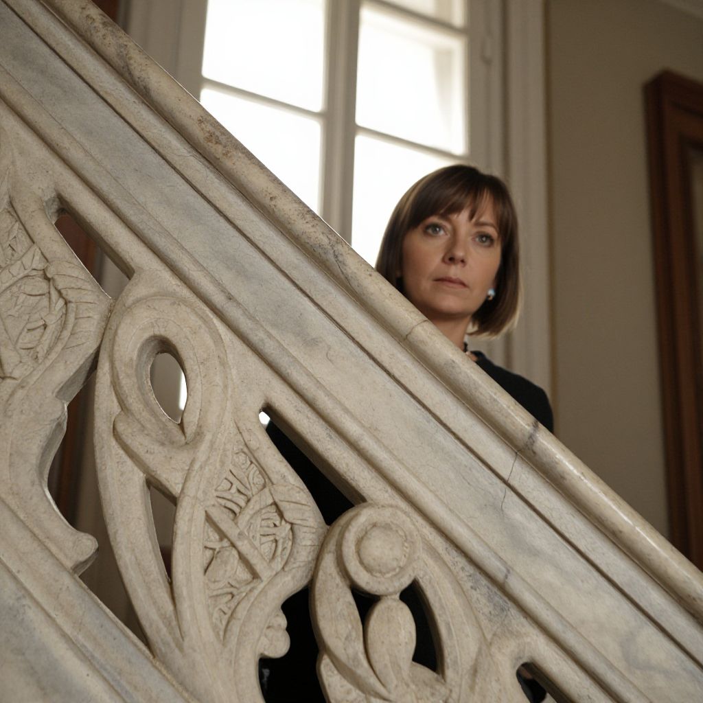 A close-up photograph of a weathered marble railing in a vintage European apartment hallway, showing intricate carvings and natural wear, with soft natural light filtering through the window behind, featuring a middle-aged woman with kind eyes and a neutral facial expression standing slightly to the side, looking toward the railing.