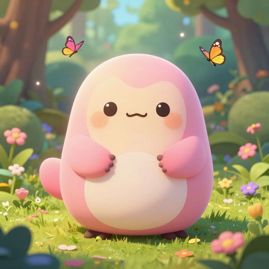 This is a digital CGI image featuring an adorable, round, yellow and white creature with small black eyes, a simple smiling line for a mouth, and pink ears and paws. It stands in a vibrant, sunlit forest clearing filled with colorful flowers and lush greenery. Two butterflies, one orange and one blue, hover near the creature's head. The background includes tall trees with sunlight filtering through the foliage, creating a warm and inviting atmosphere. The creature's round, plush-like texture contrasts with the detailed, realistic forest setting, blending cute and natural elements seamlessly.