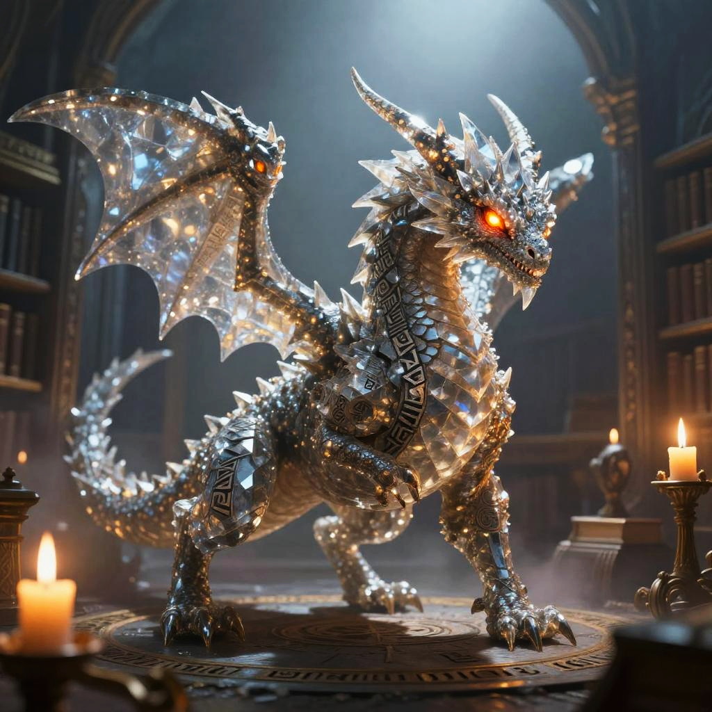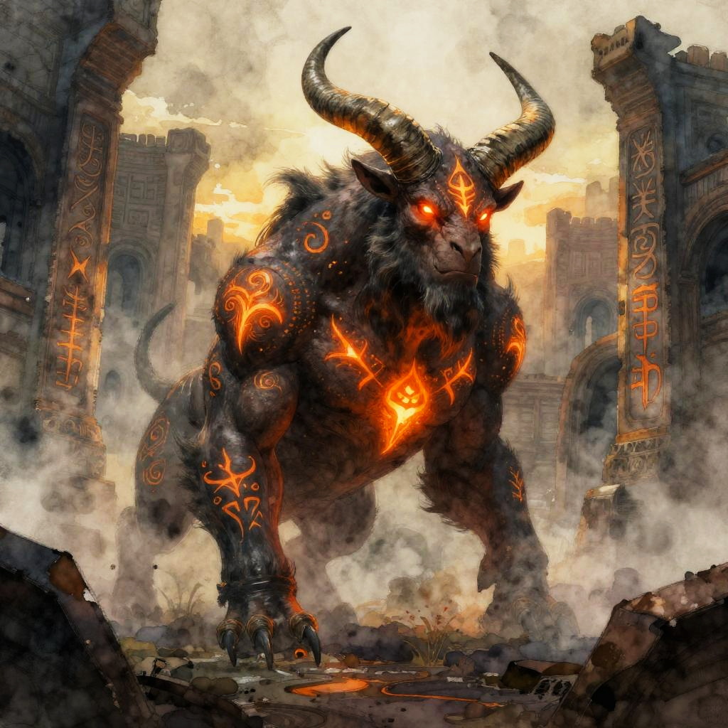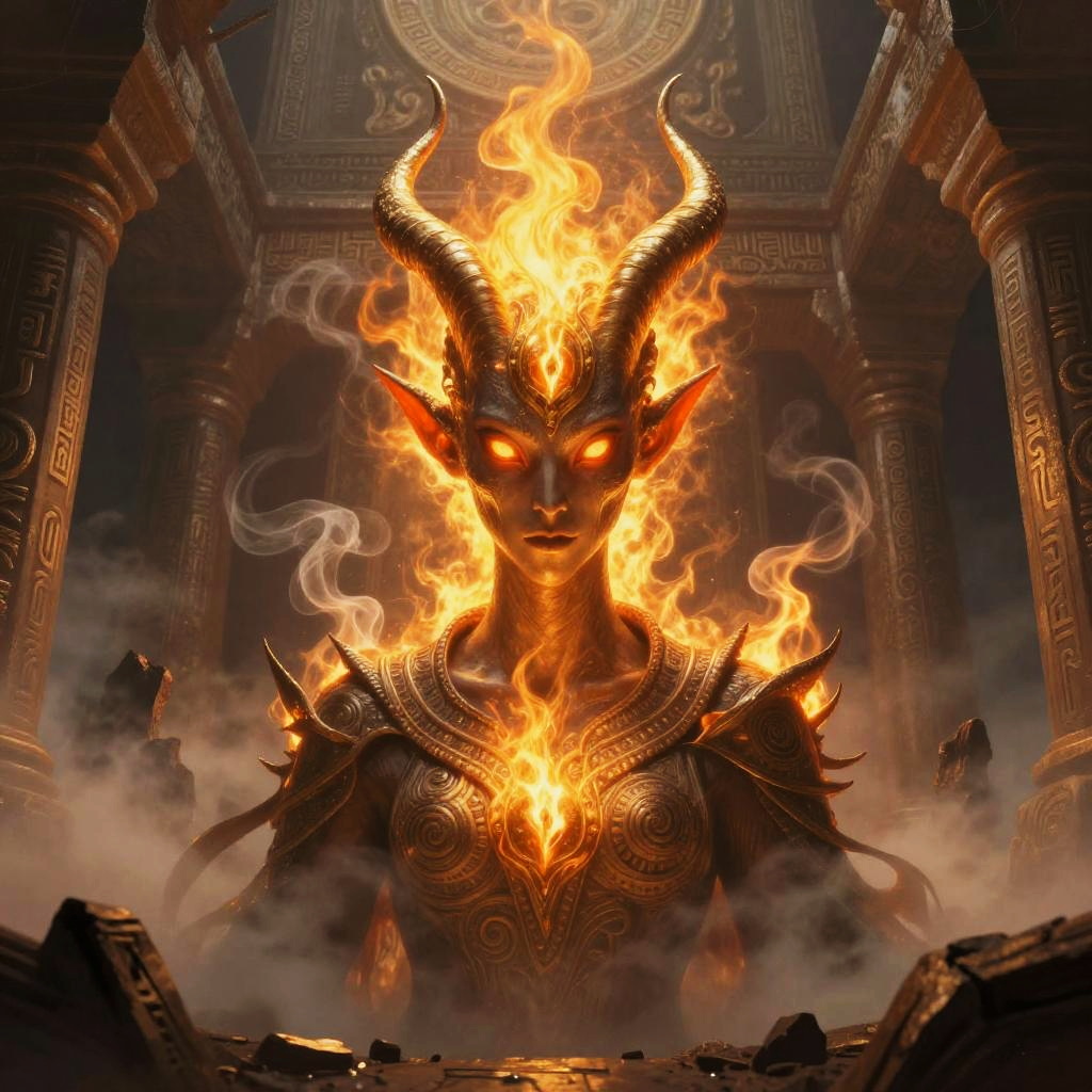 Mythic cockatrice with fiery crested plumage and molten eyes, pupils razor-slit and glowing fiery orange, ancient runes swirling and carved into surfaces, set within burning wasteland scattered with glowing embers, surreal fantasy atmosphere, digital painting, cel-shaded graphic, golden-hour rim light, soft volumetric fog, atmospheric perspective, dramatic contrast, subtle bloom, intricate textures, immersive depth, evocative color grading