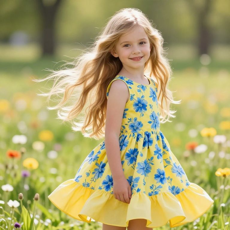 A beautiful girl with long, flowing blonde hair, wearing a vibrant orange dress that gently billows in the breeze, and a matching orange beret tilted slightly on her head. She stands in a sunny meadow with soft green grass and blooming flowers, her expression joyful and carefree, with a warm, natural light casting gentle shadows around her. The overall atmosphere is cheerful and dreamy, evoking a sense of freshness and innocence.