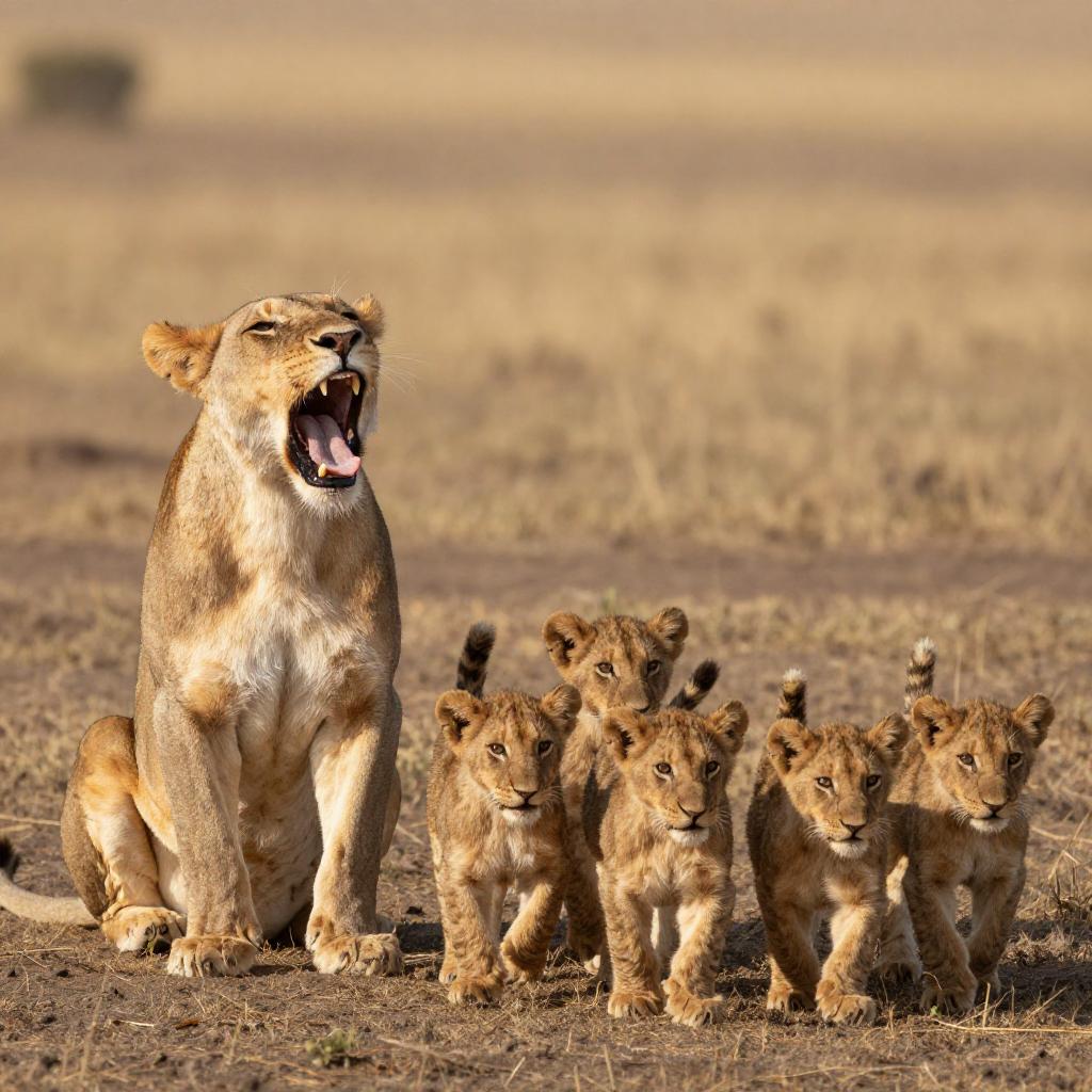 Photograph of a male lion with a full mane lying on the ground, flanked by two lion cubs. The lion is on the left, the cub in front is nuzzling him, and the other cub is behind. Sunlight casts a warm glow, highlighting their tawny fur. Camera angle is slightly low, capturing the trio from the front. Depth of field is shallow, with the background blurred, showing some greenery and rocks.