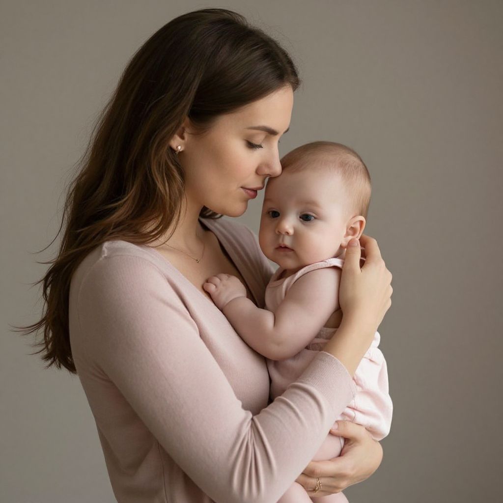 Photograph of a light-skinned woman with long, wavy brown hair, wearing a pale pink t-shirt, gently cradling a light-skinned baby with sparse brown hair, dressed in a matching pale pink onesie. The woman gazes lovingly at the baby, her right hand resting on the baby's head, and her left arm supporting the baby's back. The background is a plain, soft gray, emphasizing the tender moment. The lighting is soft, highlighting the gentle expressions and creating a serene, intimate atmosphere. The image focuses on the emotional connection between the woman and the baby.
