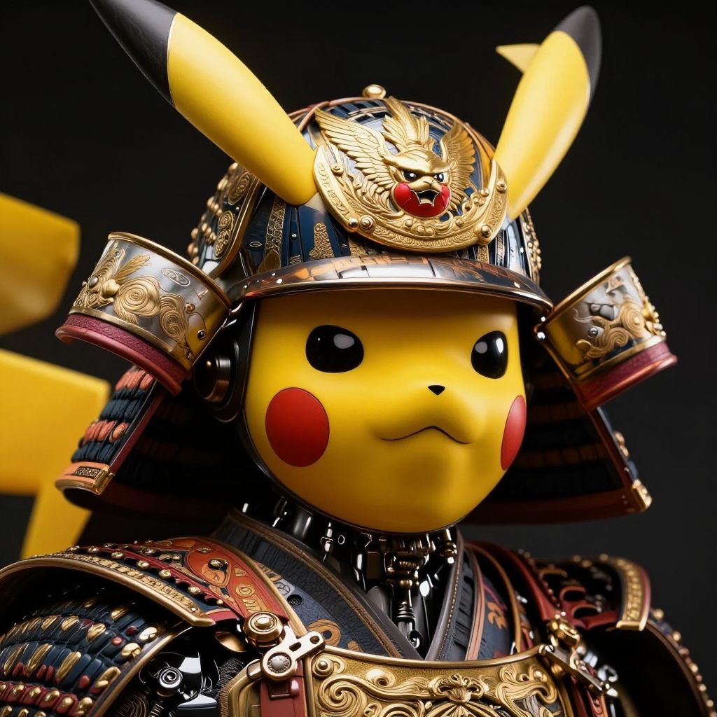 Japanese samurai portrait, helmetwith horns, Pikachu Pokemon design closed masked, intricately sculpted, Bruneian feel, Malay Samurai, very detail all yellow maskrealistic hyper-detailed, machine-like precision, robotic, cinematic, gold colour, eagle designs maskexpressionism, chrome metal, algorithmic male boy maskartistry, 32k uhd, scifi motif, aesthetic, masterpiece, intricatedesign, epic composition, perfectproportion, luminism, futurism, octane render, unreal engine, darkbackground, cinematic angle, cinematic lighting