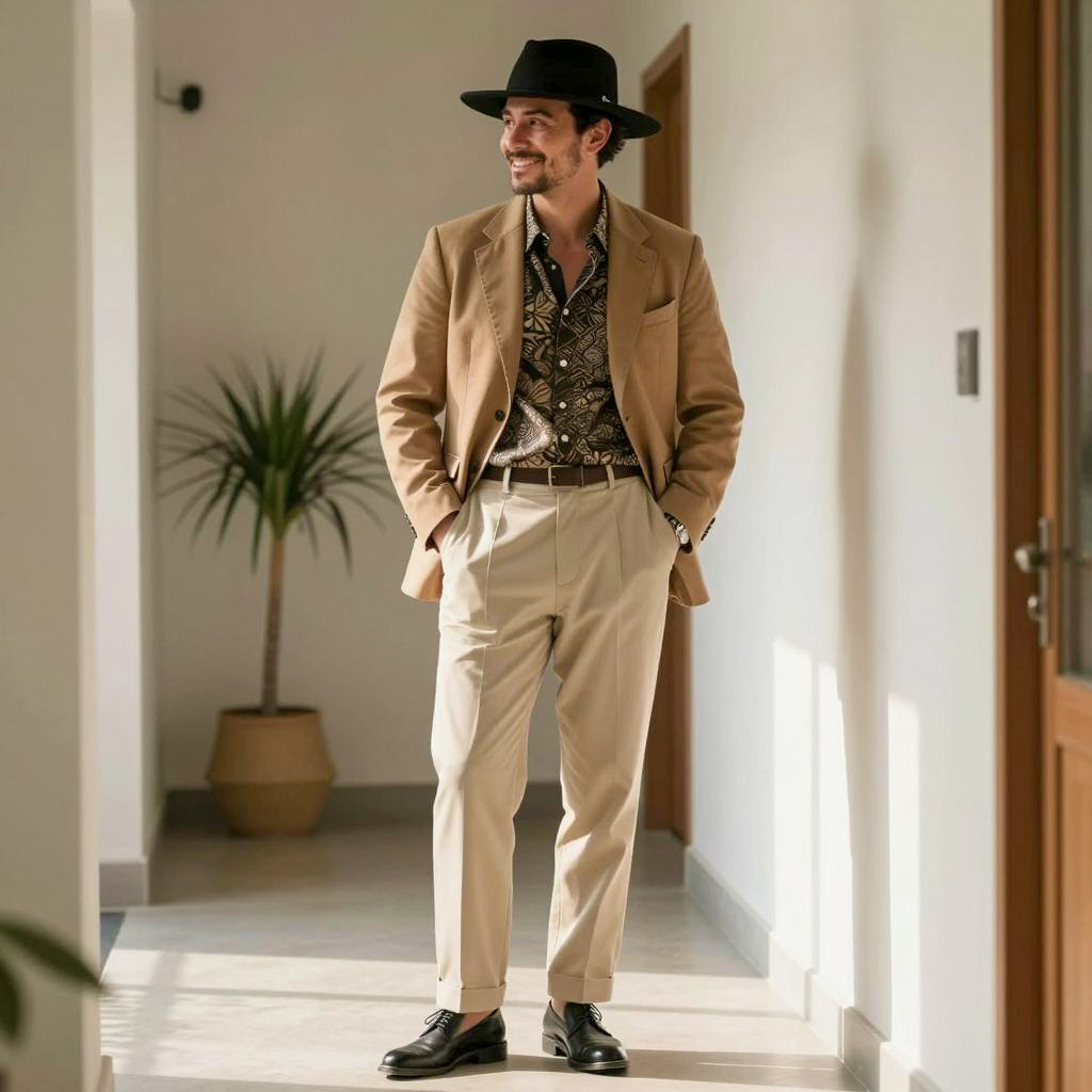 Photograph of a man standing in front of a red torii gate. He wears a gray fedora, black leather jacket with red buttons, white pants, and black shoes. He holds the fedora with his right hand, partially covering his face. The background includes a wooden altar with red and black items. The man is centered, with his body facing forward and his head slightly turned. Text "CKS*JAPAN" is in the bottom right corner.