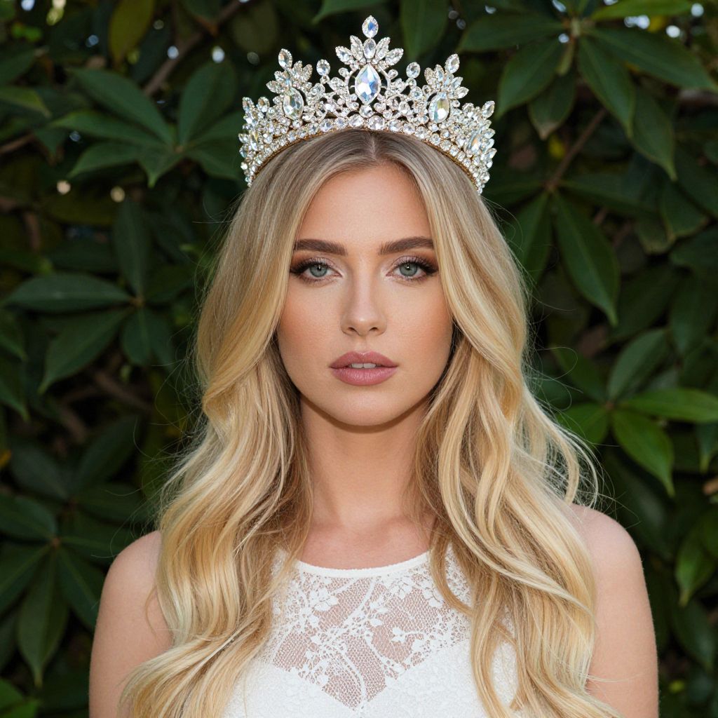 Blonde woman wearing a sparkling mermaid crown with intricate crystal details, styled with loose waves and a white lace top, set against a lush green backdrop.
