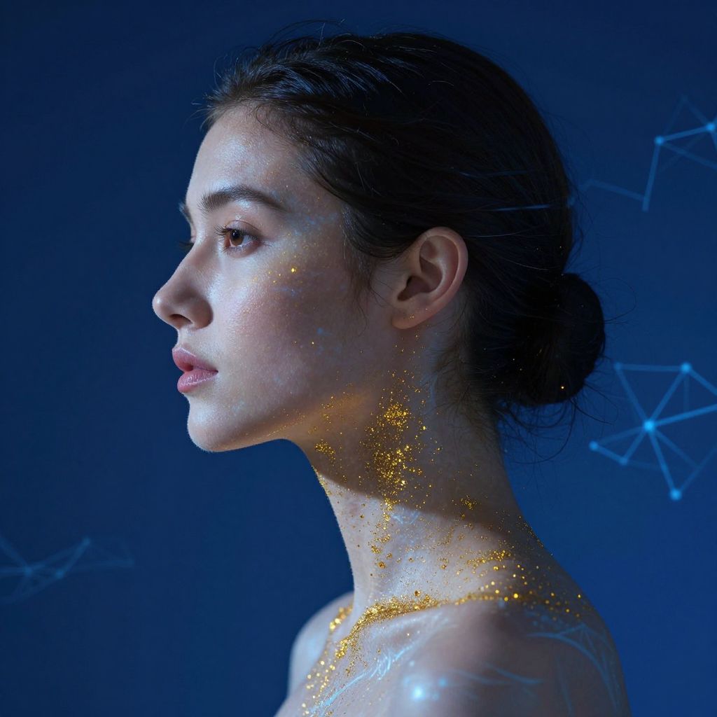 Profile portrait of a woman bathed in a celestial glow, her face adorned with golden specks that cascade down her neck, set against a deep blue background with subtle neural network-like patterns overlaying her skin.