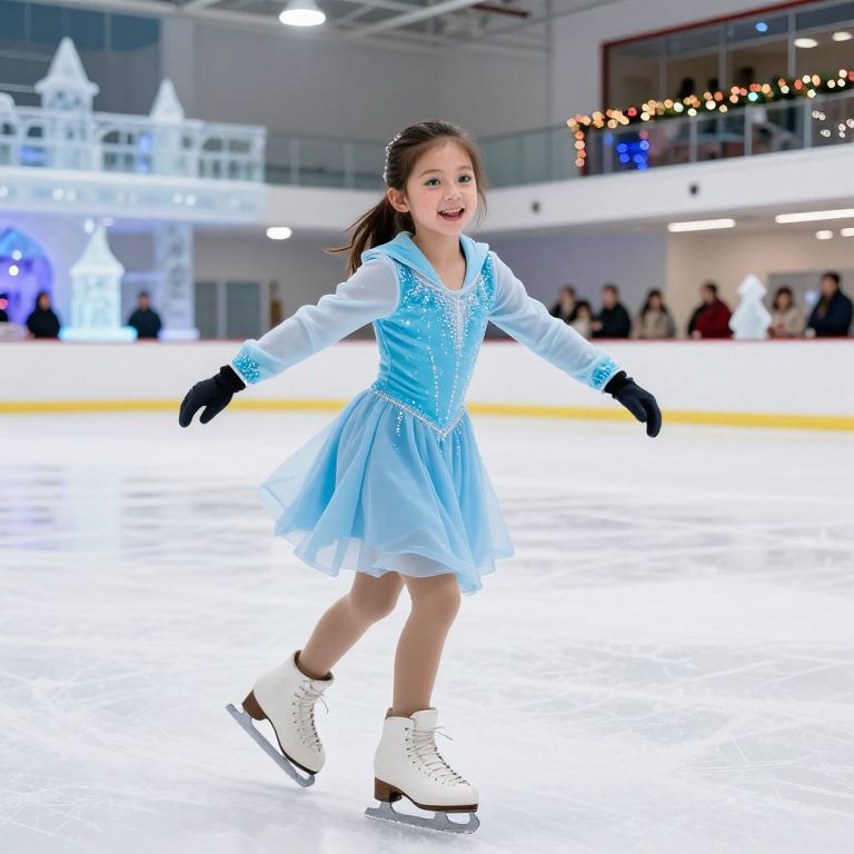 Photograph of a young girl ice skating, wearing a light blue, sparkly dress, white skates, black gloves, smiling, in a brightly