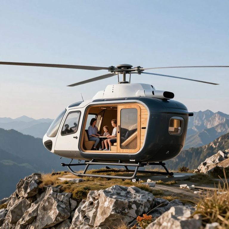 Inward tiny house on top of a mountain family living in it, they have an electro super modern helicopter to go down,