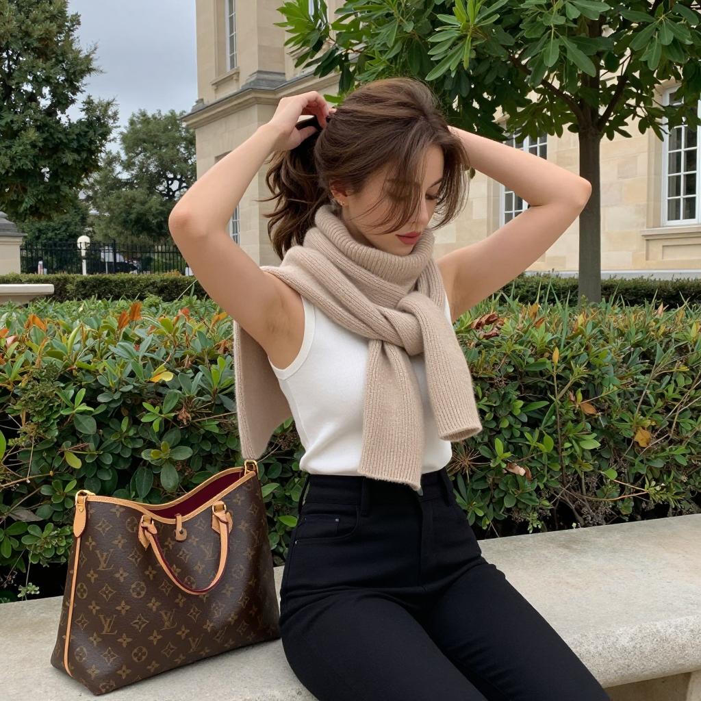 Light-skinned woman with brown hair tied in a ponytail, wearing a white sleeveless top, black high-waisted pants, and a beige knit scarf draped over her shoulders. She is seated on a stone bench, holding her hair up with both hands. A Louis Vuitton monogram handbag rests beside her. The background features a green hedge, leafy trees, and a beige stone building under an overcast sky.