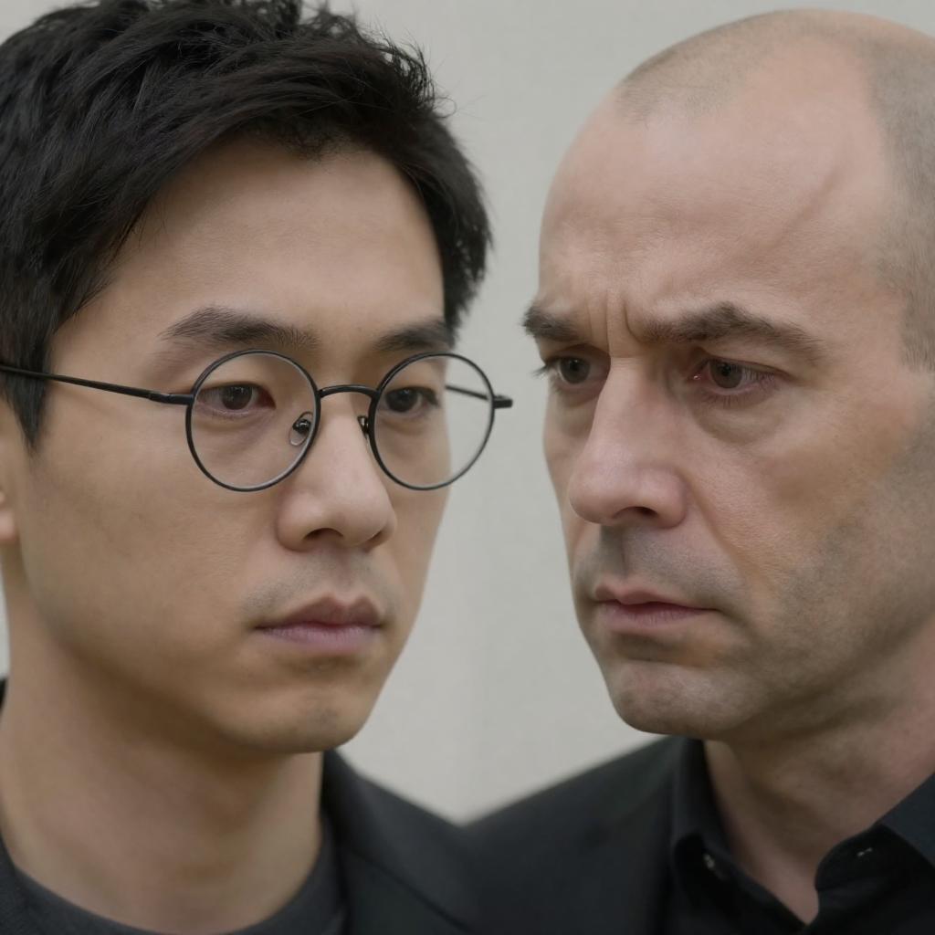 Close-up portrait of a bald Asian man with fair skin wearing large brown-rimmed glasses and a brown shirt. He has a serious and focused expression, looking slightly downward. The background is blurred greens, suggesting an outdoor setting.