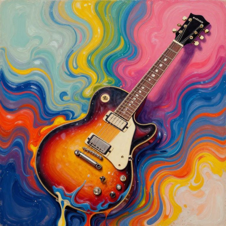 Vibrant, swirling abstract painting of a sunburst electric guitar with black and white pickups, surrounded by colorful, wavy patterns in blues, yell
