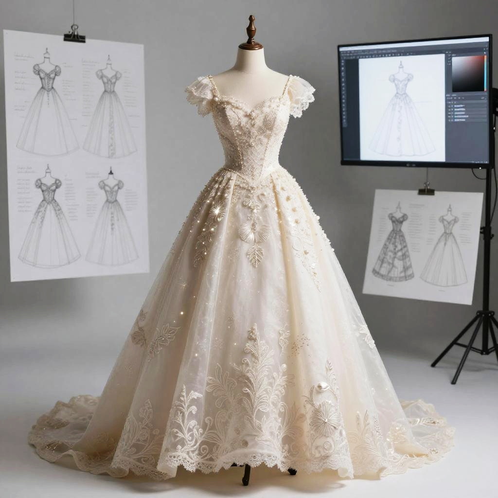 Sketch fashion designer rendering a series of elegant evening gowns with flowing fabrics and delicate embellishments, pencil and ink sketches on textured paper, surrounded by creative tools like rulers, erasers, and sewing patterns in a cozy atelier.