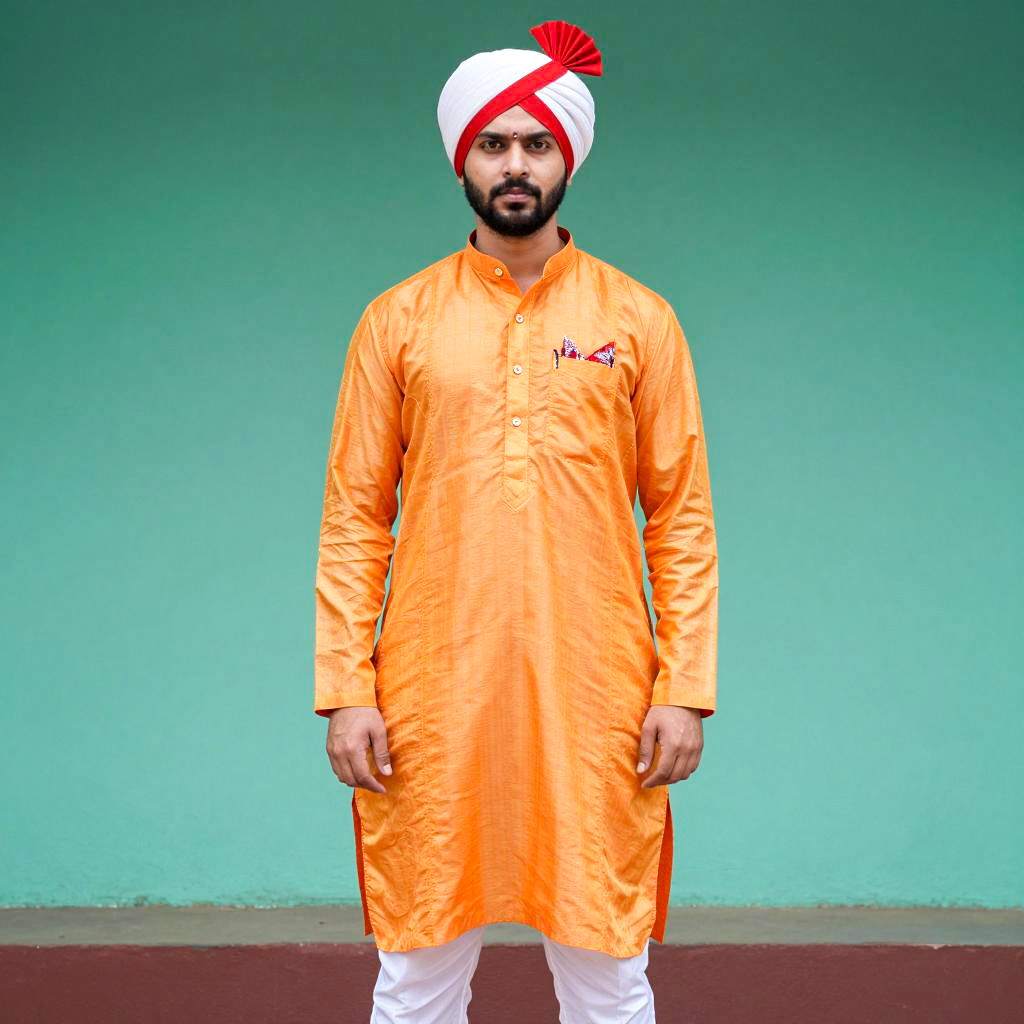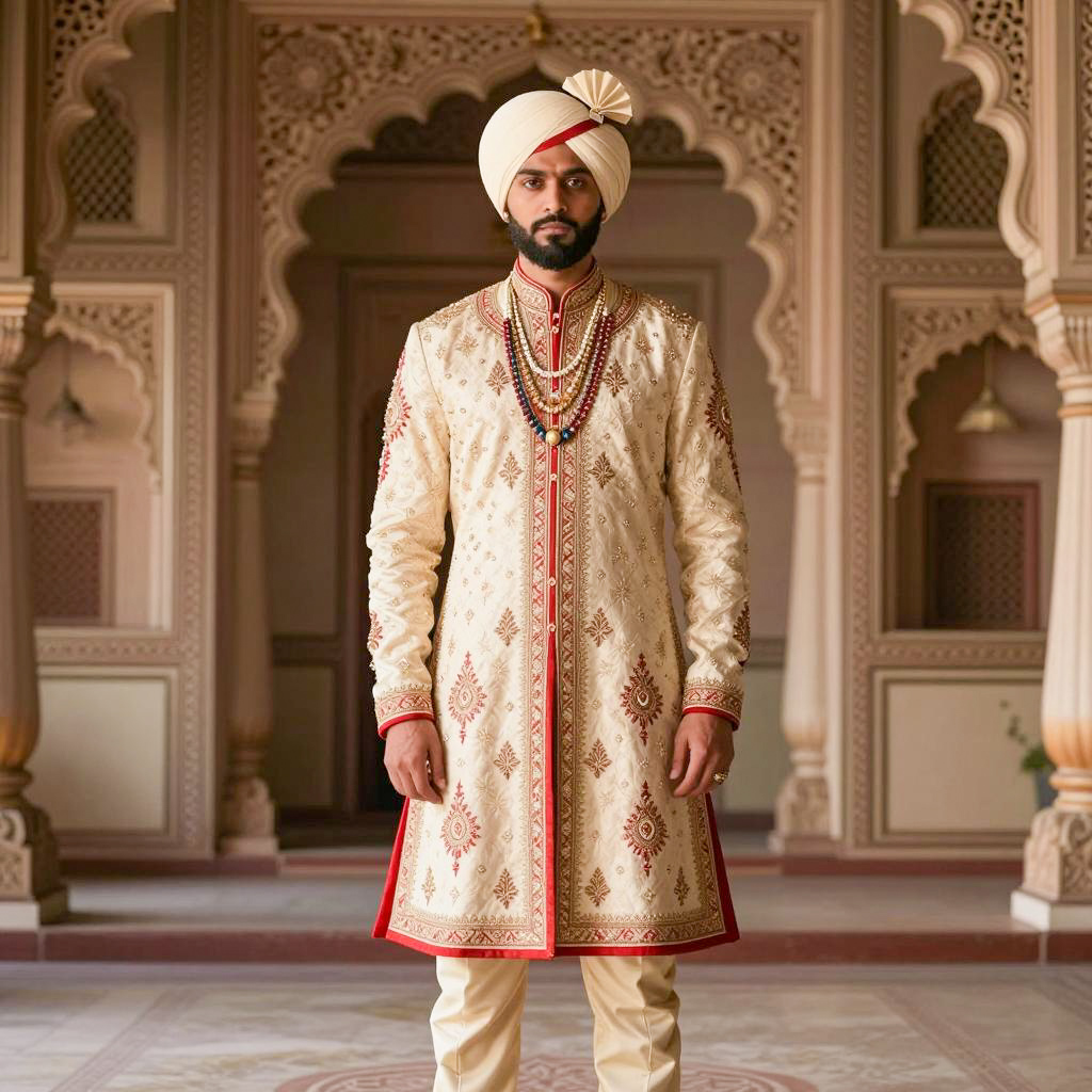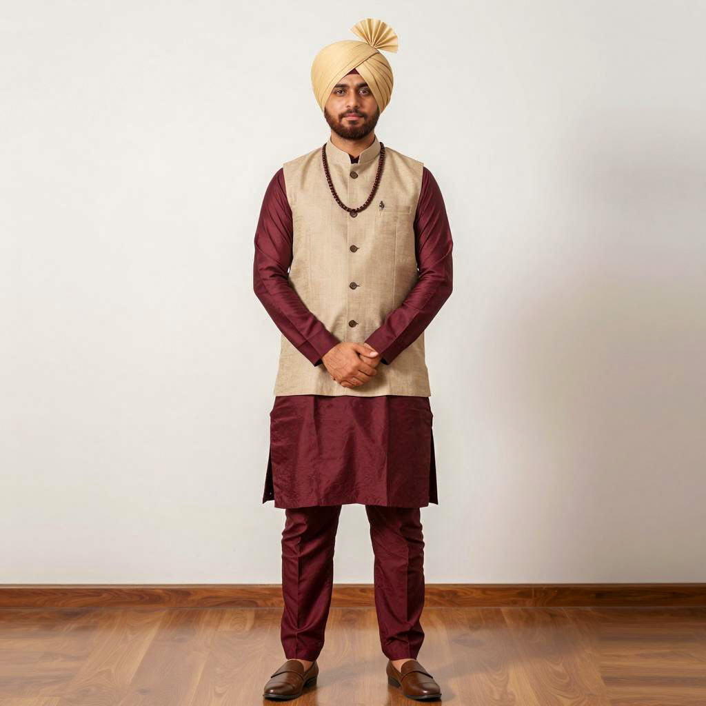 Man wear marriage party, photograph of a man standing in a plain room, wearing traditional Indian outfit, beige knee-length vest, maroon long-sleeve shirt, beige turban, maroon pants, brown shoes, beaded necklace, folded hands, neutral expression, brown beard, medium build, studio lighting, wooden floor, white wall background, in bottom left corner, portrait orientation, full body shot