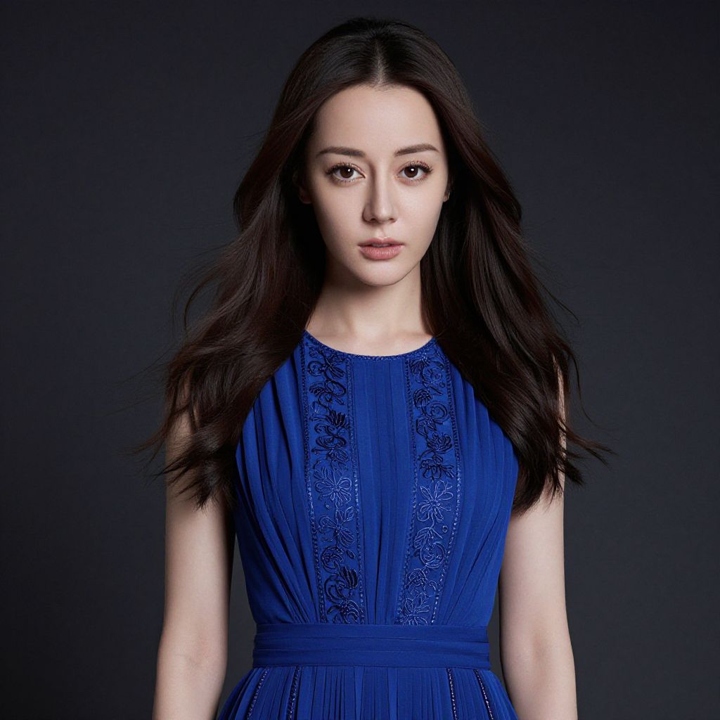 A poised young woman gazes directly at the viewer, exuding confidence and elegance. Her flowing dark hair and exquisite blue attire contrast beautifully against the dark backdrop, creating a striking visual harmony. The soft lighting enhances her features, accentuating the intricate details of her outfit.