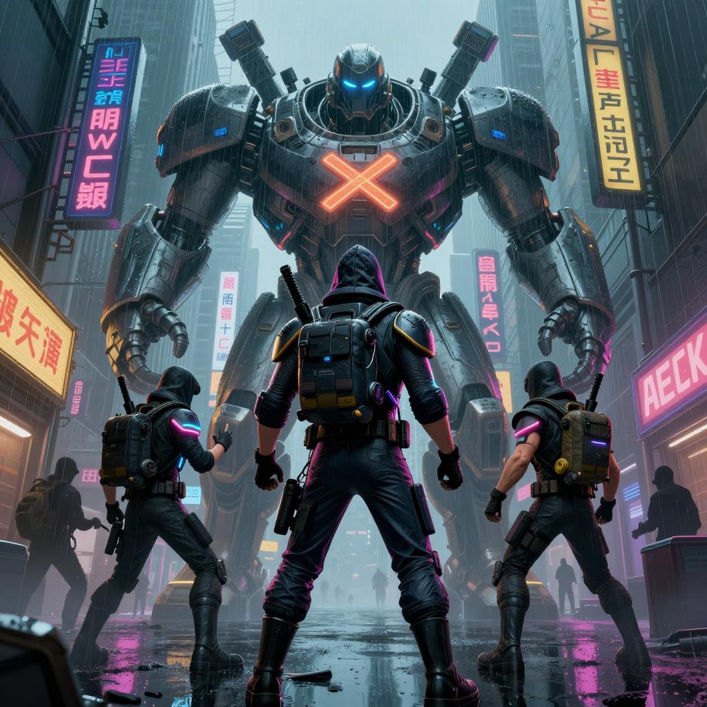 Cyberpunk Hackers Facing Giant Robot in Neon Tokyo