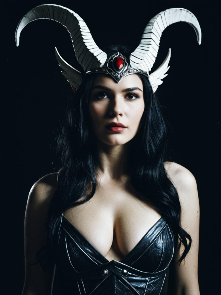 Photorealistic studio portrait of a woman dressed as the Lilith goddess. She has long black hair, wears a black leather corset with silver detailing, and a red cape. She is adorned with a silver and red horned headpiece and elf-like ears. The makeup features bold red lipstick and defined eyebrows.