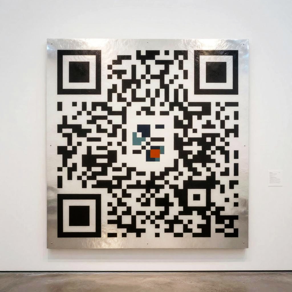 A large 3D sculptural installation of a QR code displayed in a contemporary gallery setting. The artwork combines minimalist black and white patterns with subtle colorful accents in the center. The metallic texture of the piece reflects light, creating dynamic visual effects. This conceptual art piece blends technology and modern sculpture aesthetics.