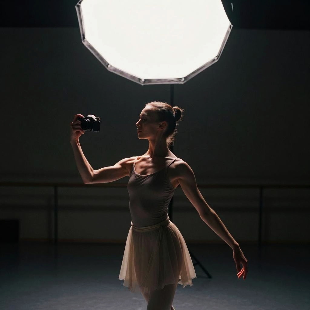 1.1)(back:1.3) to the (camera:1.1) (showing:1.1) professional ballet dancer with shaved sides and a top knot with lean, muscular physique wearing a worn tulle rehearsal leotard and wrap skirt in a completely (dark:1.1) open room with the (only:1.1) (soft (volumetric:1.1) (chiaroscuro:1.2) lighting from one large softbox directly above and in front of her:1.1) (volumetric:1.1) (light:1.1). She is (glistening:1.2) and determined. The scene is shot with (Kodakportra1600:1.1) (film grain:1.1) (Analog camera:1.1) (Sharp details:1.1) (50mm:1.1)