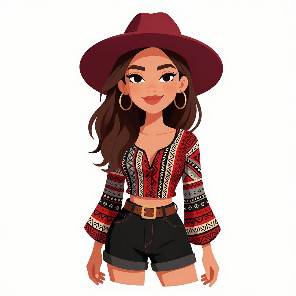 Woman with pretty face and pretty hair. smiling Woman, bohemian, patterned long sleeve top with tribal-inspired print in red, gray, and black, scoop neckline, short black tailored shorts, brown leather belt with a simple buckle, dark red wide-brimmed hat. --sref 1467