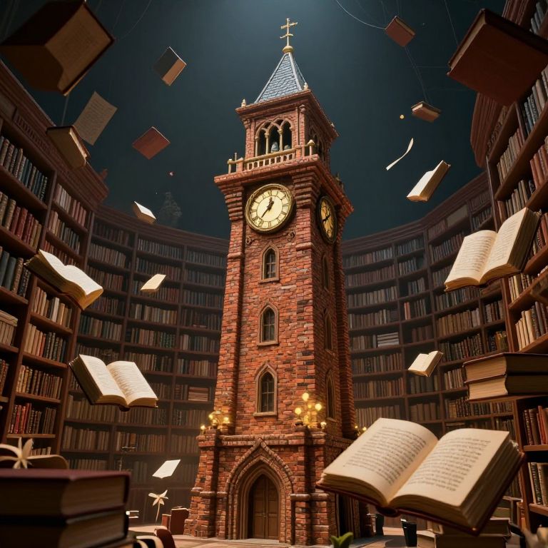 A towering clock made of ancient bricks looms over a labyrinthine library where books defy gravity, hovering mid-air with pages magically unfurling to reveal hidden knowledge.