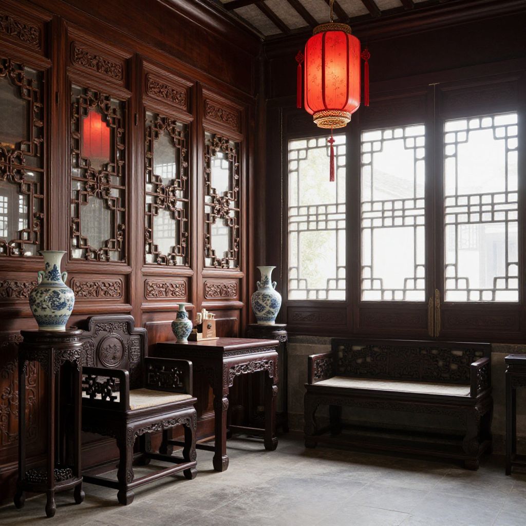 Photograph of an elegant traditional Chinese room with dark wooden furniture, intricate carvings, blue porcelain vases, red lantern, and sunlight through lattice