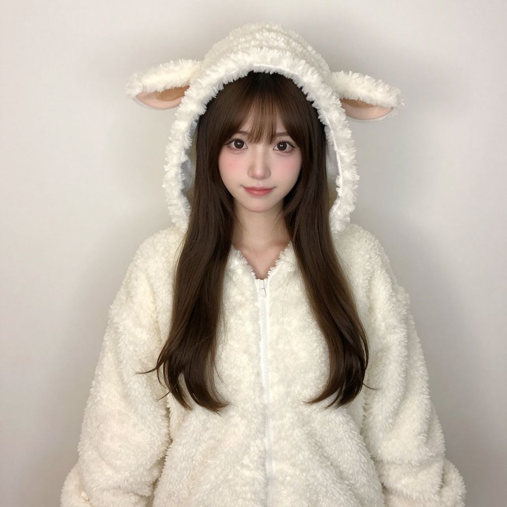 Woman sheep jumpsuit costume, 1girl, solo, animal costume, brown hair, long hair, kigurumi, hood, looking at viewer, brown eyes, smile, realistic