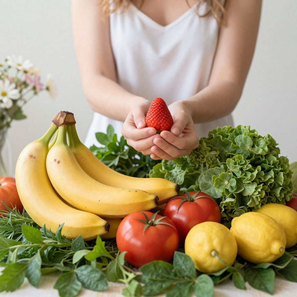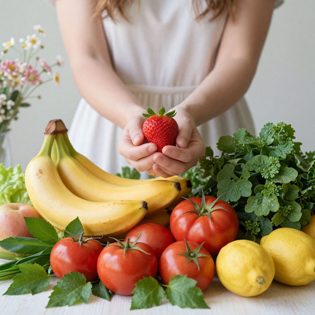 Woman holding a strawberry amidst a vibrant arrangement of fresh produce, including bananas, tomatoes, lemons, and lush green foliage, set against a soft background with delicate floral accents.