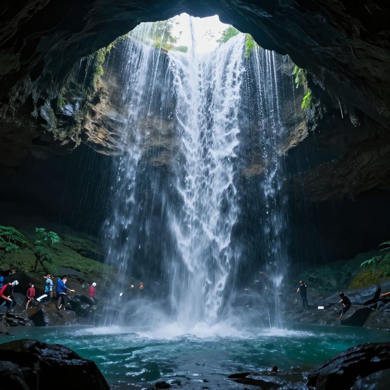 Photograph of a stunning waterfall cascading through a dark, rocky cave, with sunlight illuminating the misty pool below; people in colorful clothes stand