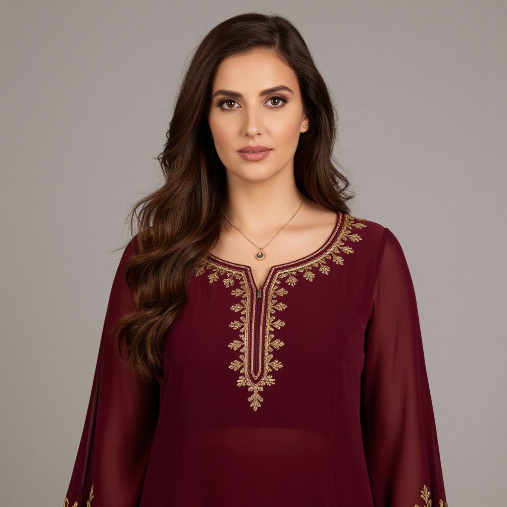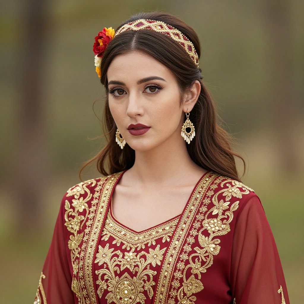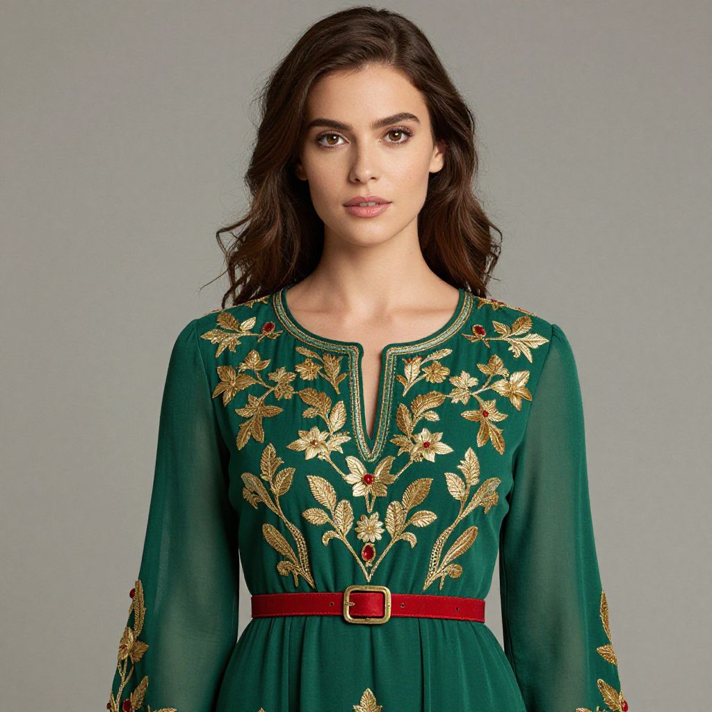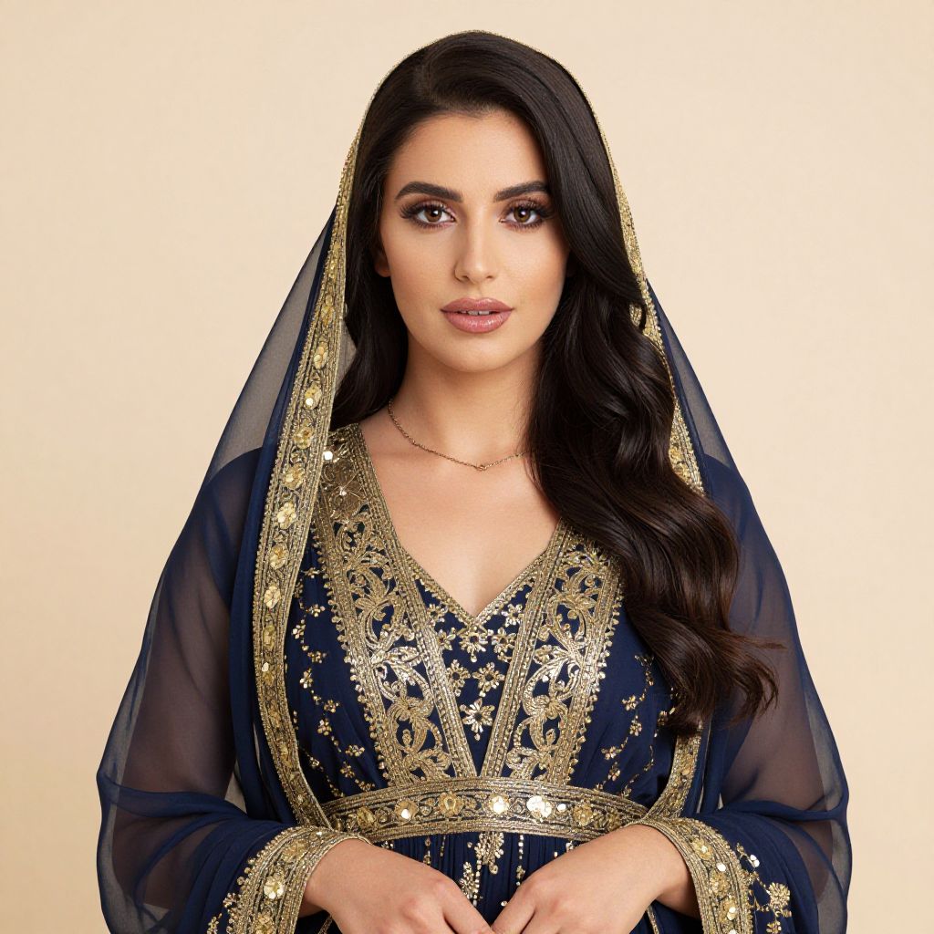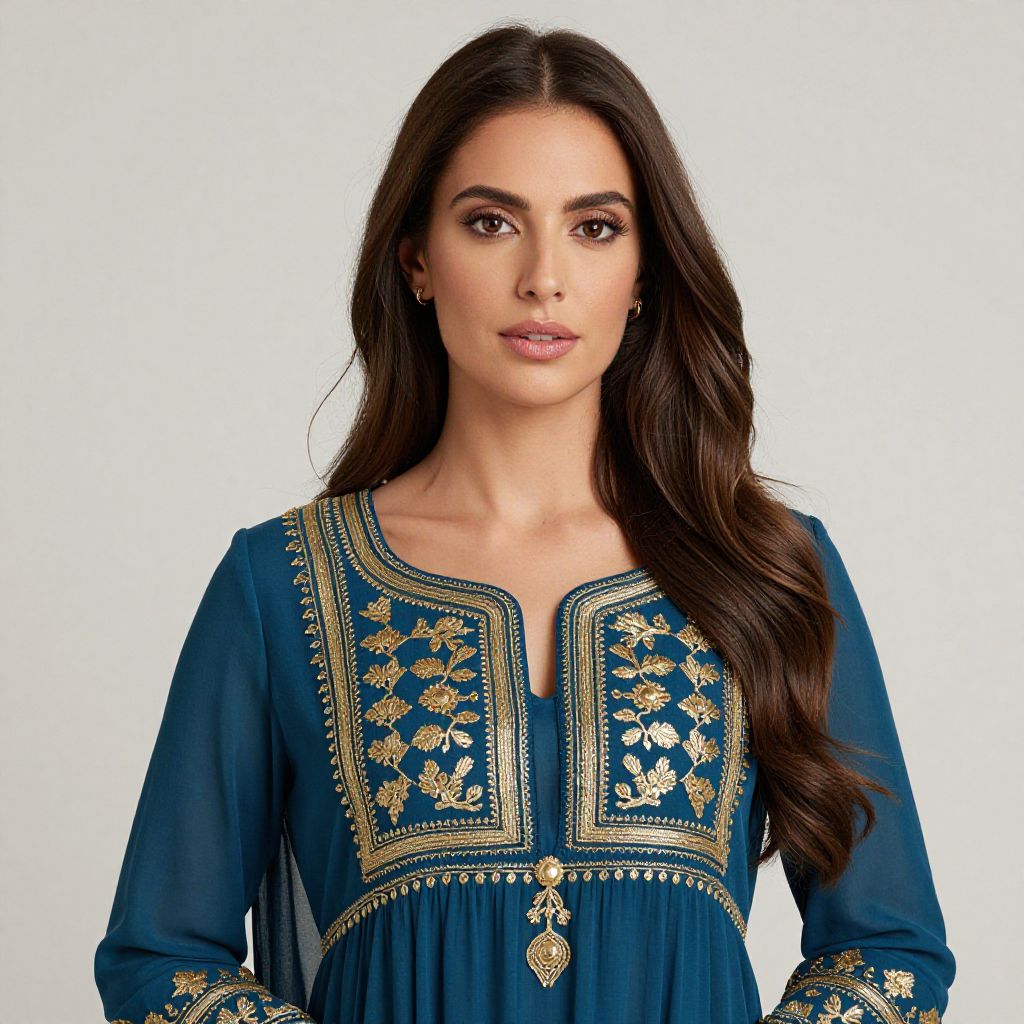 Woman with long brown hair and a blue dress with gold embroidery on it.