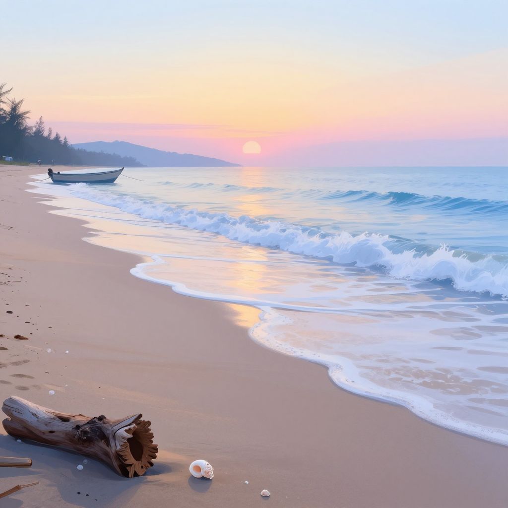 Long shot drawing portraying a serene beach scene during sunrise, gentle waves rolling onto the shore, scattered seashells and driftwood in the sand, a small boat anchored near the coast, warm pastel hues blending into cool blues, peaceful and detailed environment art.