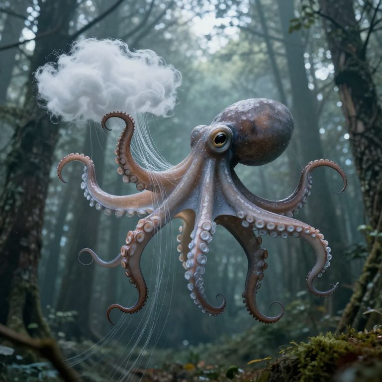 A giant octopus with glassy tentacles floats in midair, plucking strands of cloud-fiber to weave weather patterns above a silent forest.