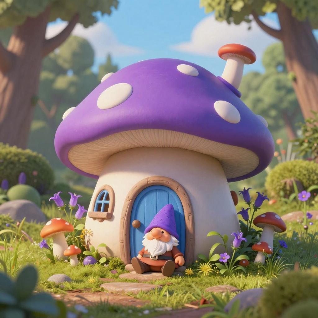 Bright and whimsical mushroom-shaped house with a mossy green cap roof and blue arched door, surrounded by colorful flowers and greenery in a sunny, fantasy garden setting. A large red-and-white spotted mushroom stands nearby, adding to the magical atmosphere under a clear blue sky.