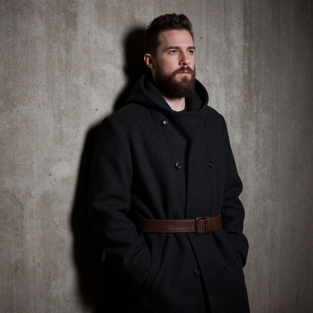 Photograph of a bearded man with short brown hair, standing against a textured, worn concrete wall. He's wearing a dark, woolen hooded coat with a brown belt. The lighting casts a strong shadow of his face on the wall, creating a moody, dramatic effect. He looks slightly to the side with a serious expression. The background is dimly lit, emphasizing the contrast with his coat.