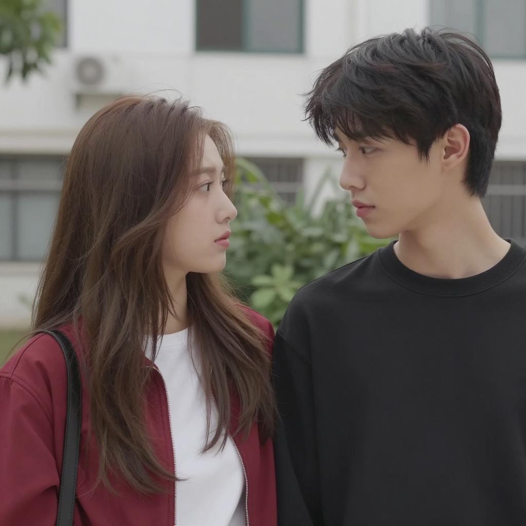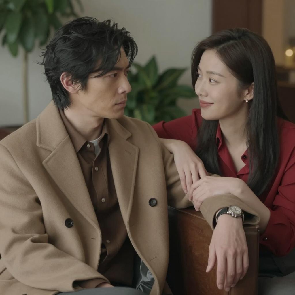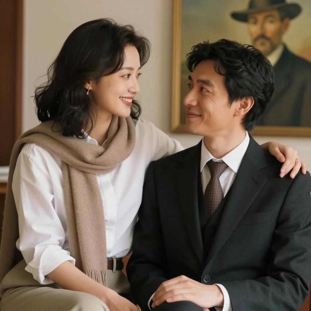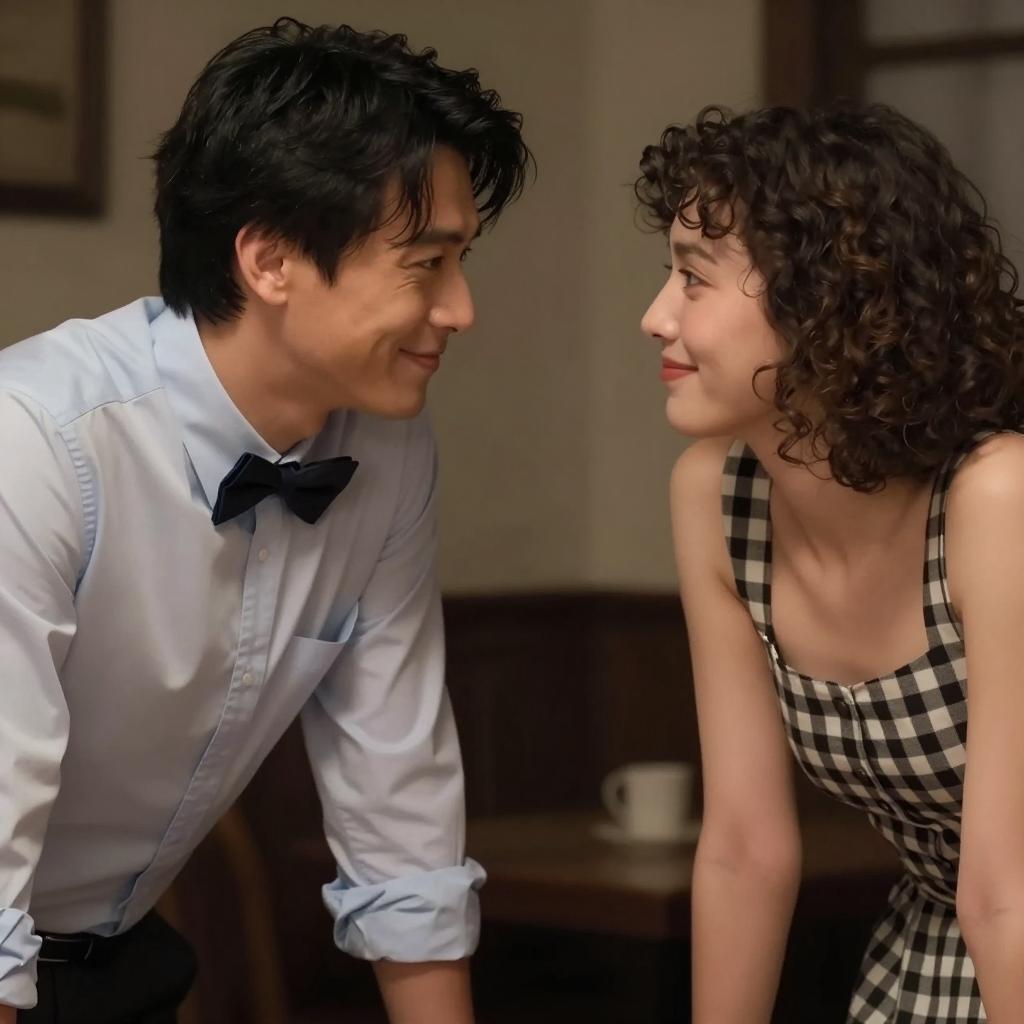Two people in close-up, facing each other. The man on the left wears a black cap, smiling. The woman on the right has dark hair, a yellow headscarf, and floral clothing, smiling. They hold glasses of dark liquid, exchanging eye contact. Background: blurred candles, patterned wall. Warm lighting.