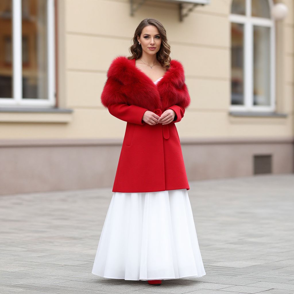 Winter Wedding Outfit Woman Costume, woman in a red coat and fur stole standing in front of a building